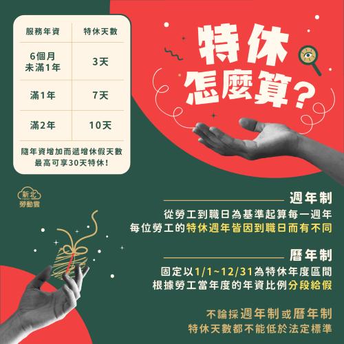 接近年底,「你今年的特休休完了嗎?」新北勞工局表示,依據《勞動基準法》規定,特別休假是每位勞工應享有的法定權利,但有分成「週年制」、「曆年制」等不同計算方式,讓民眾感到困惑,這兩種特休制度到底有何不同?對勞工權利義務產生什麼影響?新北勞工局特別比較兩種制度的差異,提醒雇主遵守法規,維護勞工休假權益。