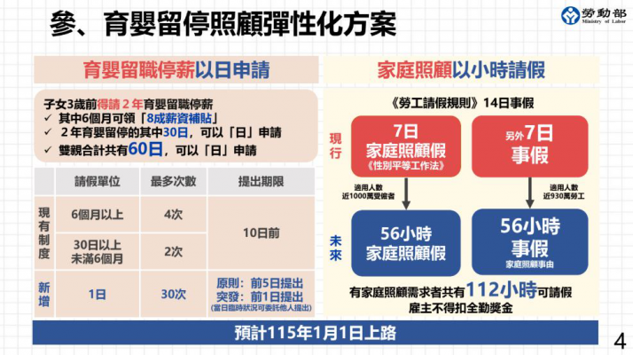 行政院長卓榮泰9月4日主持院會,聽取勞動部報告《育嬰留停照顧彈性化》方案。勞動部長洪申翰表示,新制將讓勞工可按「日」請育嬰留職停薪,遇緊急狀況也可按「時」請家庭照顧假,解決育兒與工作難兼顧的問題。此政策將於115年1月1日正式實施,幫助勞工彈性育兒不中斷職涯,雇主也能留才不缺工。