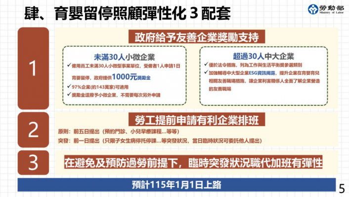 首先,考量30人以下企業占我國企業數逾97%,雇主現有人力不多,育嬰育兒勞工請假照顧小孩,勢必讓企業面臨多負擔行政成本找臨時人力、職代勞工加班費成本或營造友善職場相關措施成本(例如職代津貼)。為了不要讓雇主無法承擔因而造成更多隱性歧視現象與勞雇關係緊張等狀態,也鼓勵雇主包容勞工「育嬰留停以日請」及「家庭照顧以時請」的照顧彈性需求,由政府給予小、微型企業經濟支持,勞工申請1日育嬰留停發給雇主定額獎勵金 1,000元。另外,將企業推動優於法令之「友善家庭」措施,列為「工作生活平衡獎」參選類別,表揚並肯定企業針對員工需求,提供友善育兒措施。勞動部並透過加強輔導中大型企業ESG資訊揭露,提升企業在育嬰育兒相關友善職場措施,讓企業的利害關係人(包括投資人、客戶、員工和社會大眾)能更全面地了解企業所營造對員工的友善職場,將有利企業尋才留才。