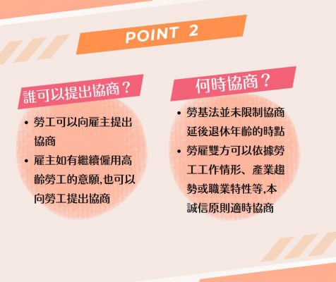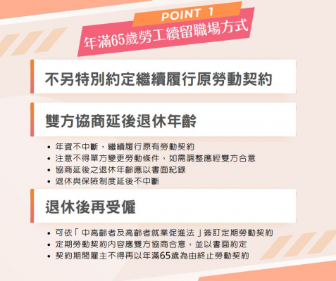 勞動部針對雇主僱用高齡者,已提供「繼續僱用高齡者補助計畫」及「職務再設計」等資源,雇主除可運用政府提供的資源外,也應本誠信原則適時協商,共同營造友善的高齡就業環境。