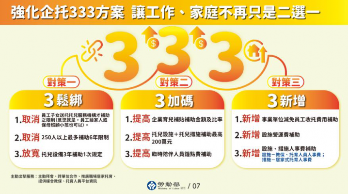 為落實「雙就業、雙照顧」政策目標,營造更友善的育兒職場環境,勞動部4日宣布推出「企托333 政府來幫忙」企業托育補助新制。透過「三鬆綁」、「三加碼」及「三新增」三大方向全面優化補助機制,預計投入新臺幣1億4,240萬元,擴大支持企業設置托育設施及推動相關托育措施,協助員工兼顧工作與家庭,同時強化企業留才誘因。新制預計於115年5月1日正式上路。