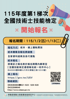 115年第1梯次全國技能檢定1/2受理報名