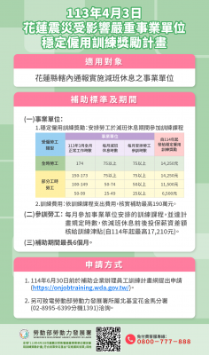 花蓮穩定僱用訓練獎勵計畫實施期間延長至明年6月底