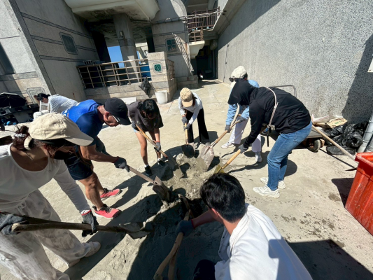 東華大學修課同學們進行瑚移植水泥磚原料混拌之實務操作。照:國立東華大學提供