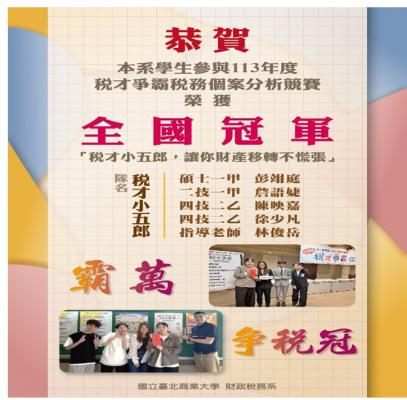 2025年財經學院財政稅務系榮獲財政部舉辦全國「稅才爭霸稅務個案分析」競賽冠軍。(圖/北商大提供)