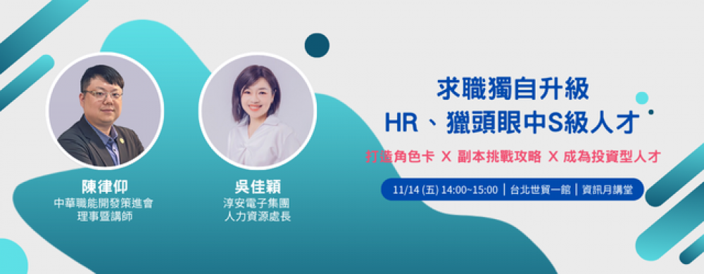 邀請中華職能開發策進會理事暨講師陳律仰、淳安電子集團人力資源處長吳佳穎對談,解析求職者在不同職涯階段該如何打造個人化的「履歷角色卡」、提升「面試臨場表現」,並以獵頭視角分享企業用人關鍵字。講座中也將揭示職場中「升級」的思維差距,幫助求職者精準對位、成為企業眼中的S級候選人。