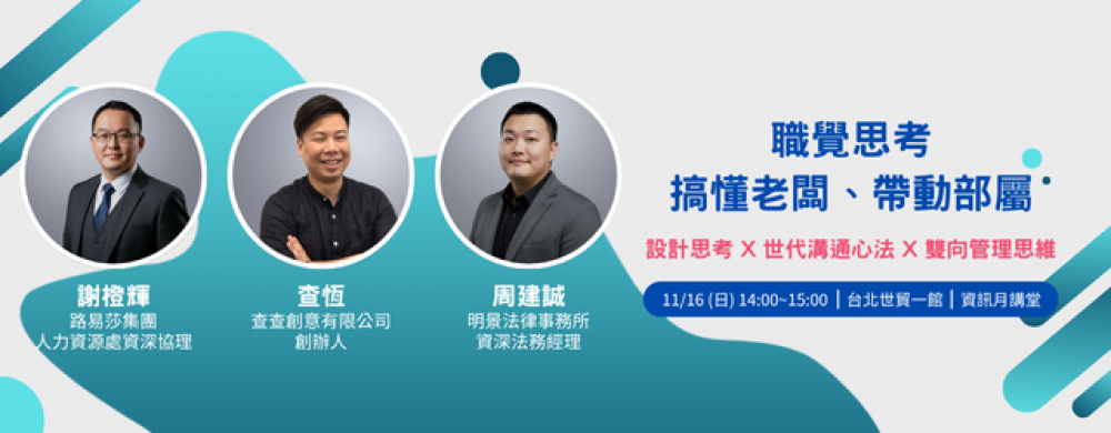 以工作者「職覺思考」為題,從管理與溝通角度切入,剖析如何在不同世代與職級間取得職場平衡。集結路易莎集團人力資源處資深協理謝橙輝、查查創意有限公司創辦人查恆,以及明景法律事務所資深法務經理周建誠共同與談。三位講者將從實務案例出發,探討如何運用「設計思考」化解溝通難題、掌握世代差異,以及以「雙向管理」策略強化團隊合作,讓「搞懂老闆、帶動部屬」不再只是口號,而是可實踐的職場能力。