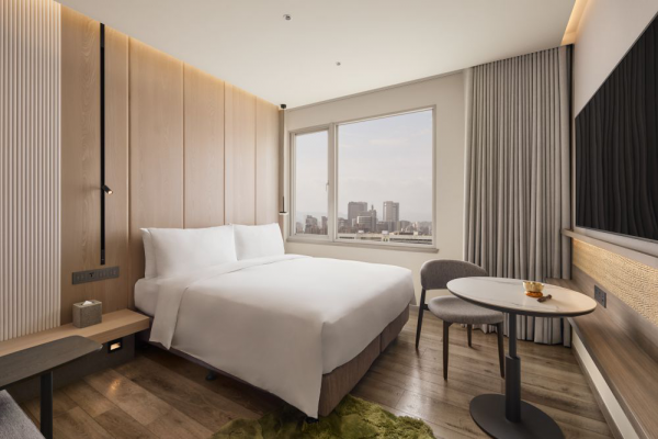 嵨開安旅預計於2026年1月正式開幕,全房採用綠建材與環保材質打造,並以沉穩低彩度的大地色系設計,在繁華的東區中營造出回歸自然。圖:嵨開安旅提供