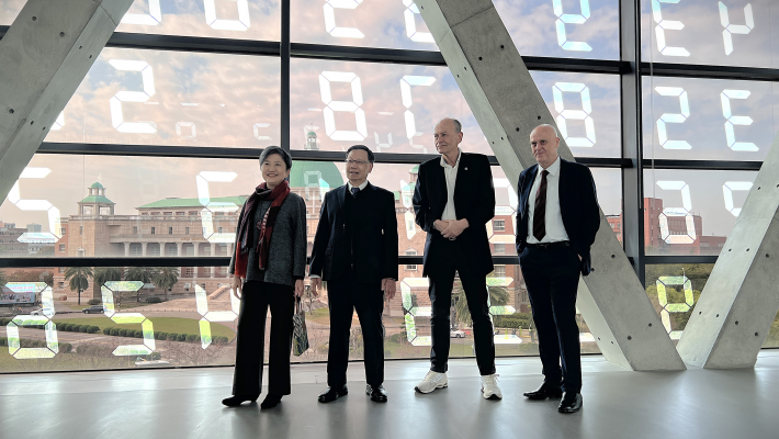 亞洲大學校長蔡進發陪同Südhof博士參訪亞洲大學現代美術館,於安藤忠雄設計的標誌性三角建築窗前合影留念。照:亞洲大學提供。