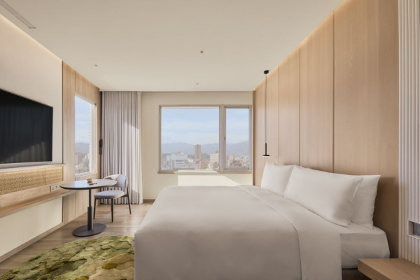 111 間客房鋪設草地紋理地毯,搭配溫潤木質與低視覺噪音設計,讓旅人一踏入房內即自然放鬆。房內備有台灣在地小農茶飲,讓「回房泡一壺茶」成為旅程中的靜心儀式。客房影音系統特別規劃 呼吸練習、體位引導與台灣少見的克里亞瑜伽內容,讓旅人無須離房,也能進行身心練習。樓層之間則以「水光廊道」串連,提供親膚軟水,水流、氣泡與自然光在轉角交會,提醒旅人放慢呼吸節奏。