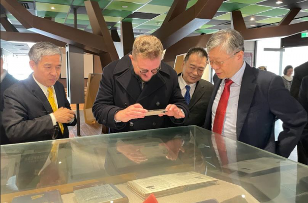 Datavault AI主席暨執行長Nathaniel Bradley參觀上海聖約翰大學校史典藏暨研究中心,拿起手機對著曾任中華民國第5任總統的約大校友嚴家淦展示資料拍攝留念。照:聖約翰科技大學提供