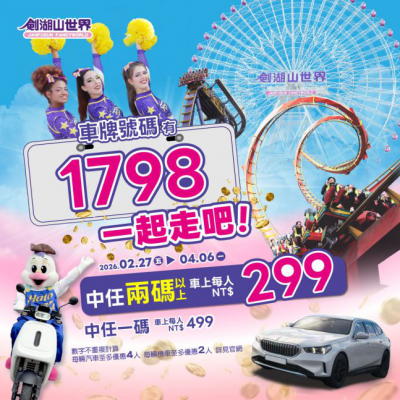 劍湖山推出「一起走吧,1798車牌優惠專案」,車牌號碼對中 「1」、「7」、「9」、「8」任兩碼,即可享有門票299元的超值購票優惠。圖:劍湖山世界提供