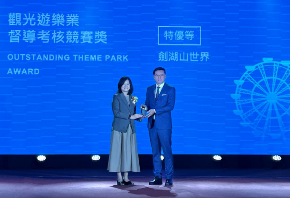 劍湖山世界主題樂園榮獲觀光署「特優等」遊樂園之肯定,劍湖山世界主題樂園協理高銘鑕(右)代表該樂園於觀光署表揚大會接受觀光署長陳玉秀頒獎。圖:劍湖山世界提供