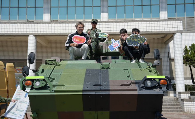 嘉藥學生爬上雲豹輪型裝甲車拍攝留念。照:嘉南藥理大學提供
