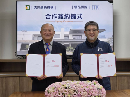 雲品國際與德光建築機構簽署委託經營合約,將於台中沙鹿發展旅宿暨餐飲事業,右一為雲品國際總經理丁原偉,左一為德光建築機構林榮金董事長。圖:雲品國際提供
