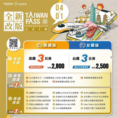 觀光署說明,Taiwan PASS本次改版將過去較為複雜的5款產品(包含高鐵與台鐵的經典版、景點版及亮點EasyGo版)整合為「高鐵版」(定價2,800元)與「台鐵版」(定價2,500元)。這2款產品分別以高鐵或台鐵的「3日周遊券」為主軸,解決長途跨區交通需求;此外,旅客還能從四大都會捷運中任選一項,並從15項景區接駁中自選一項服務,一票在手即可輕鬆串聯全台熱門景點。