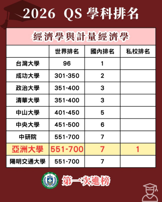在「經濟學與計量經濟學」領域,亞洲大學為首次進入QS學科排名,落在全球第551–700名區間,直接與中央研究院、陽明交大等頂尖學術機構並駕齊驅,並列全國第七,並光榮奪下全台私立大學第一!這項傲人成績,印證了本校商管與經濟領域的研究實力已具備世界級水準。