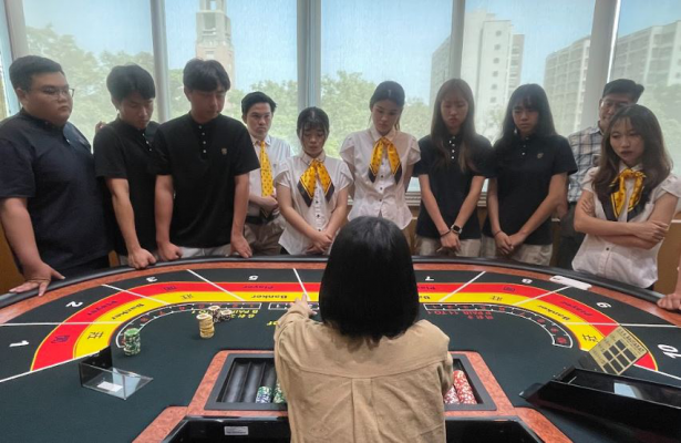 新加坡知名頂奢酒店博弈娛樂部門與國立高雄餐旅大學休閒暨遊憩管理系攜手舉辦為期兩天的「博弈荷官工作坊」,特別邀請兩位任職於新加坡知名地標奢華酒店的傑出系友返校,將國際級娛樂城的實戰技術與職場操守第一手傳承給學弟妹,充分展現高餐大在國際休閒服務領域的領先地位。